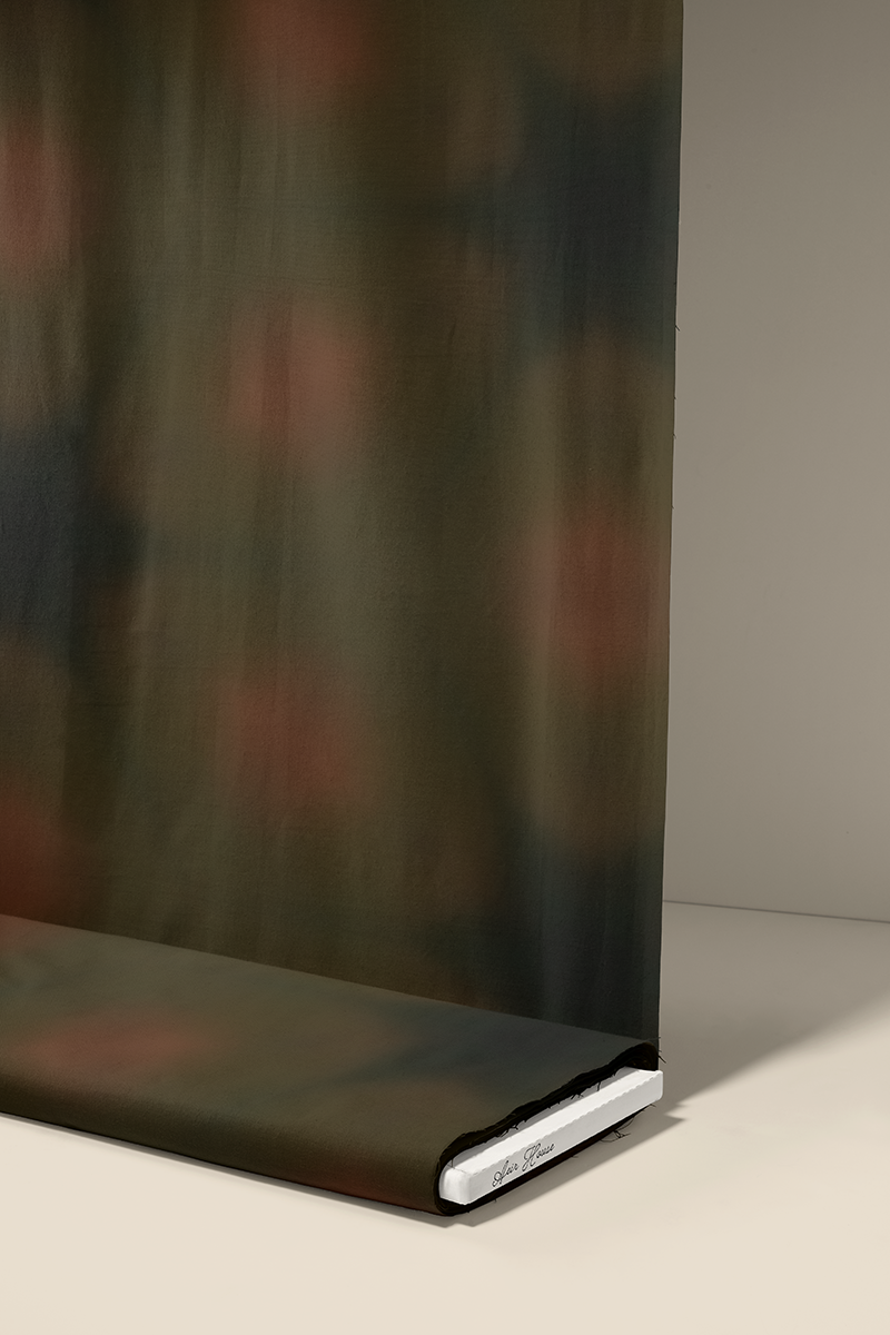 Across the repeats, block-like forms emerge. These structured elements create rhythm across the surface, echoing stepping paths, garden beds, and fragments of landscape.